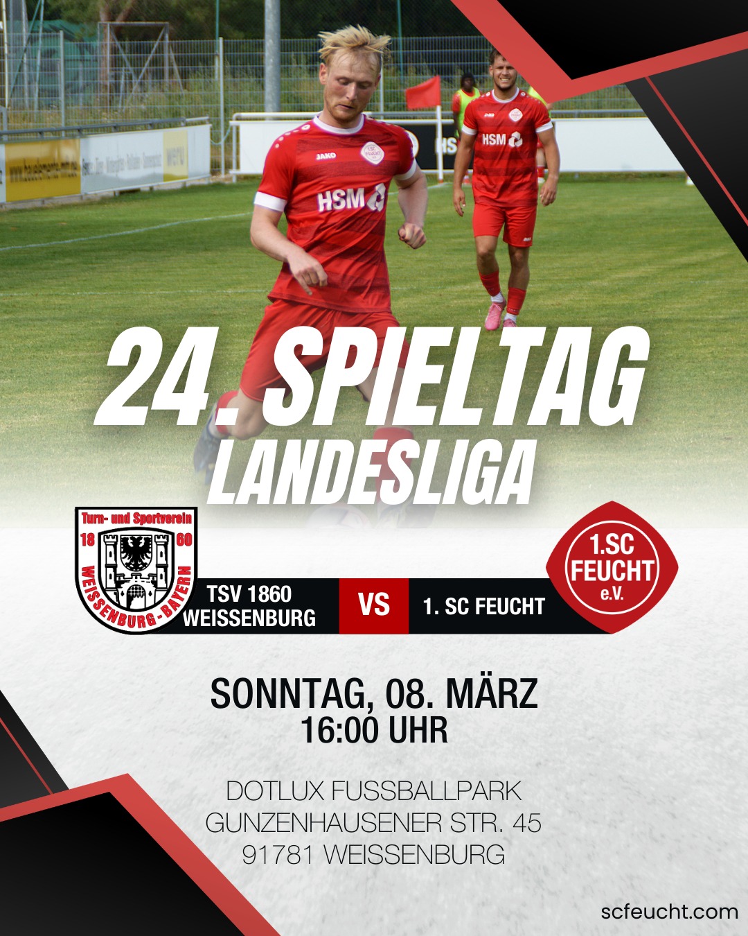 Landesliga Nordost - In der Landesliga Nordost kommt es am Wochenende zum 24. Spieltag. Der 1.SC Feucht und sein Tross reisen zum TSV 1860 Weißenburg. Mit Blick auf die Tabelle ist es für beide Teams ein wichtiges Spiel. Der TSV braucht dringend Punkte im Kamp um den direkten Klassenerhalt wohingegen der SC bei einem Erfolg die Gefahrenzone erstmal weit hinter sich lassen könnte.