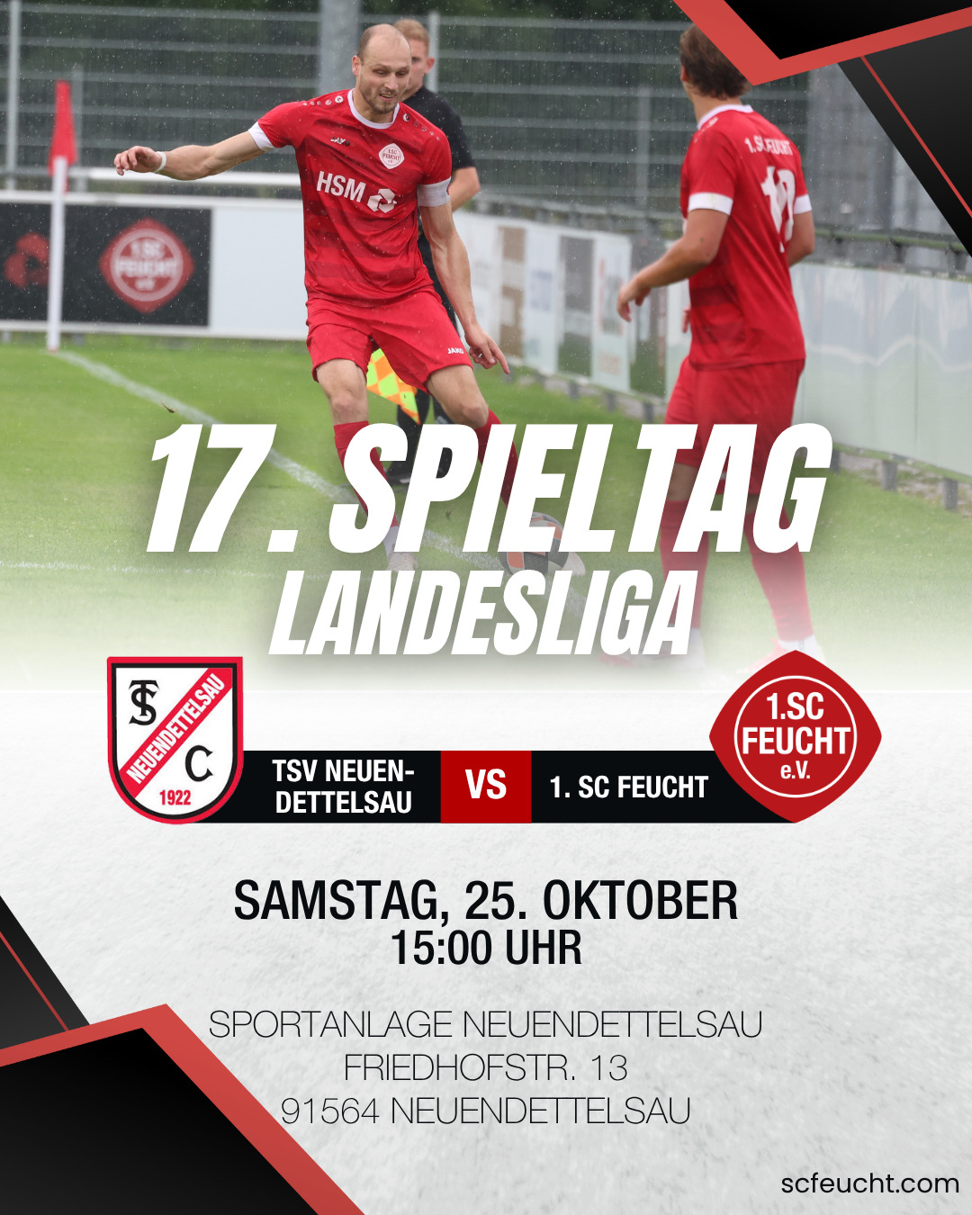 Landesliga Nordost - In der Landesliga Nordost kommt es am Wochenende bereits zum 17. Spieltag und somit zum letzten Spieltag der Vorrunde in der Spielzeit 2025/2026. Der 1.SC Feucht gastiert zum Abschluss der Vorrunde beim Aufsteiger TSC Neuendettelsau. Tabellarisch gesehen ist es ein Spiel in der unteren Tabellenhälfte, wobei der Anschein etwas trügt, denn so liegen aktuell zwischen dem 6. Tabellenplatz und dem 13. Gerade einmal 4 Punkte Unterschied.