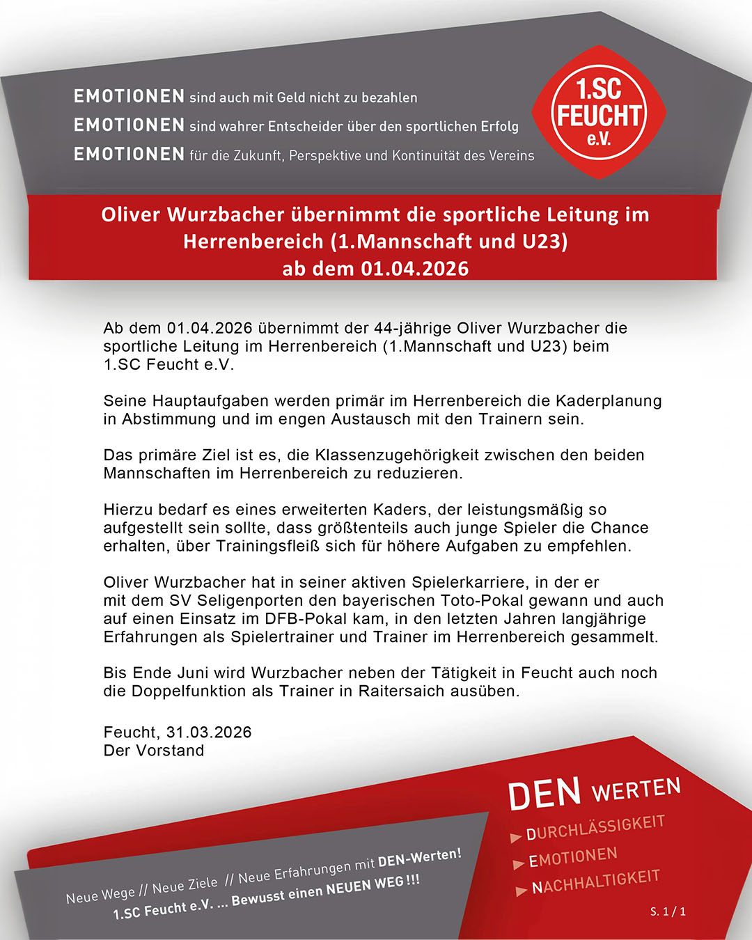 Oliver Wurzbacher übernimmt die sportliche Leitung im Herrenbereich (1.Mannschaft und U23) ab dem 01.04.2026